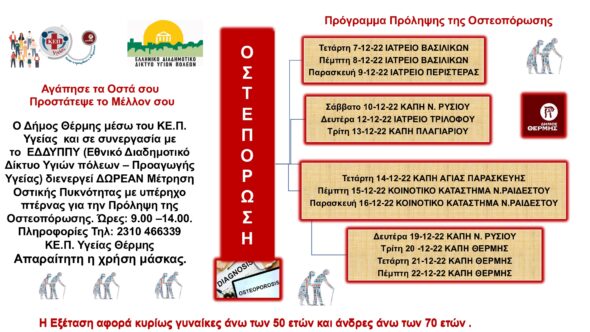 Ο δήμος Θέρμης μέσω του ΚΕ.Π. Υγείας και σε συνεργασία με το ΕΔΔΥΠΠΥ (Εθνικό Διαδημοτικό Δίκτυο Υγιών πόλεων – Προαγωγής Υγείας) διενεργεί ΔΩΡΕΑΝ Μέτρηση Οστικής Πυκνότητας με