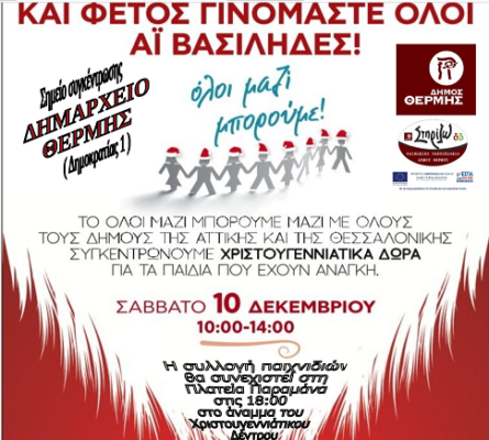 Στην καθιερωμένη δράση για τη συγκέντρωση χριστουγεννιάτικων παιχνιδιών με στόχο κανένα παιδί να μην μείνει χωρίς το δώρο του, προχωρά και φέτος ο δήμος Θέρμης,