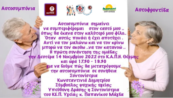 Το ΚΕ.Π. Υγείας Θέρμης ξεκινάει τις ομάδες Ψυχολογικής Ενδυνάμωσης, σε συνεργασία με την Σύμβουλο Ψυχικής Υγείας Κωνσταντινιά Δημητρίου. Το πρόγραμμα απευθύνεται σε όλες τις ηλικίες και περιλαμβάνει τέσσερις συναντήσεις κάθε μήνα, με συγκεκριμένη