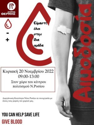 Η δεύτερη για το 2022 προγραμματισμένη αιμοδοσία της εθελοντικής ομάδας αιμοδοτών του Νέου Ρυσίου πραγματοποιείται την Κυριακή 20 Νοεμβρίου από τις 09.00 το πρωί έως τις 13.00
