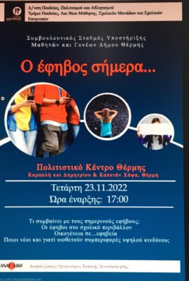 Την ερχόμενη Τετάρτη 23 Νοεμβρίου 2022 και ώρες 17.00 – 20.00 στο Πολιτιστικό Κέντρο Θέρμης επί της οδού Καραολή και Δημητρίου, θα διεξαχθεί θεματική ημερίδα με θέμα: «Ο έφηβος σήμερα…». Η ημερίδα