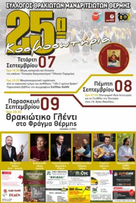 Ο Σύλλογος Μανδριτσιωτών Θρακιωτών Θέρμης διοργανώνει τα 25α Κοσμοσωτήρια που θα διαρκέσουν από 7-9 Σεπτεμβρίου. Αναλυτικά το πρόγραμμα των εκδηλώσεων περιλαμβάνει: Τετάρτη 7/9 και ώρα 18.30 Μέγας εσπερινός