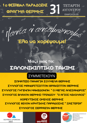 Το 1ο Φεστιβάλ Παράδοσης με τίτλο «ΠΑΝΤΑ Ν’ ΑΝΤΑΜΩΝΟΥΜΕ» διεξάγεται την Τετάρτη 31 Αυγούστου 2022, στις 8 το βράδυ, στο Φράγμα Θέρμης, στο πλαίσιο των