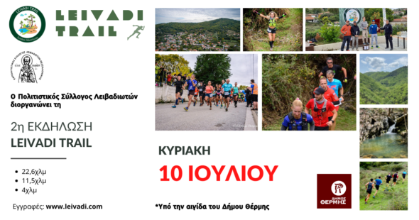 Την Κυριακή 10 Ιουλίου διοργανώνεται το 2ο Leivadi Trail με πρωτοβουλία του πολιτιστικού συλλόγου Λειβαδιωτών και υπό την αιγίδα του δήμου Θέρμης. Οι διαδρομές φέτος θα είναι τρεις