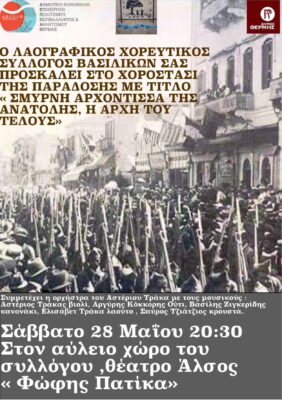 Ο λαογραφικός Χορευτικός Σύλλογος Βασιλικών διοργανώνει το Σάββατο 28 Μαίου 2022 και ώρα 20:30 το ‘’Χοροστάσι της παράδοσης’’ στον αύλειο χώρο του συλλόγου ‘’Φώφη Πατίκα’’