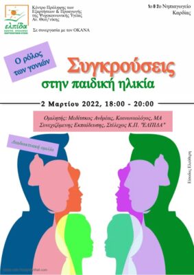 Το Κέντρο Πρόληψης «ΕΛΠΙΔΑ» και το 1ο και 2ο νηπιαγωγείο Καρδίας, οργανώνουν διαδικτυακή ομιλία με τίτλο: “Συγκρούσεις στην Παιδική Ηλικία: Ο Ρόλος των Γονιών”. Η διαχείριση