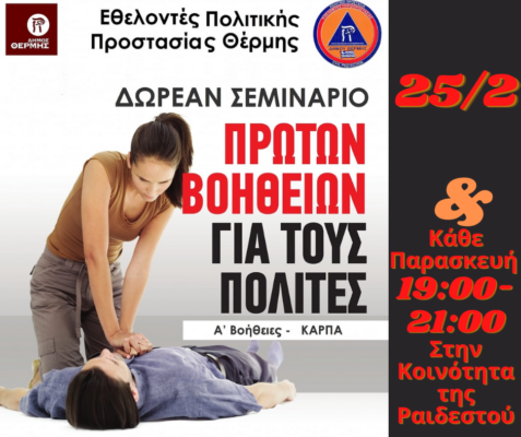 Η ομάδα εθελοντών Πολιτικής Προστασίας Θέρμης σε συνεργασία με τον δήμο Θέρμης και την κοινότητα της Νέας Ραιδεστού, διοργανώνει σειρά αυτοτελών σεμιναρίων διάρκειας δύο ωρών