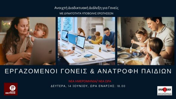 Την Δευτέρα 14 Ιουνίου και ώρα 18.00 πρόκειται να πραγματοποιηθεί η αναβληθείσα τελευταία διαδικτυακή διάλεξη με τίτλο «Εργαζόμενοι Γονείς & Ανατροφή Παιδιών» που διοργανώνουν η