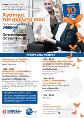 Δωρεάν διαδικτυακό σεμινάριο με θέμα την Οστεοπόρωση και την Οστεοπενία διοργανώνει το Διαδημοτικό Δίκτυο Υγειών Πόλεων σε συνεργασία με το Σύλλογο Σκελετικής Υγείας “Πεταλούδα” Τετάρτη