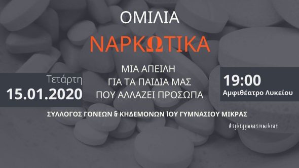 Σήμερα Τετάρτη 15 Ιανουαρίου 2020 διεξάγεται η ενημερωτική εκδήλωση με το επίκαιρο θέμα των Ναρκωτικών, που απασχολεί όλους τους γονείς,η οποία πραγματοποιείται με πρωτοβουλία του
