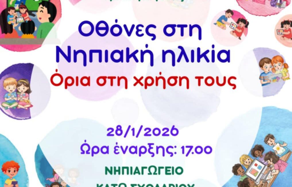 Μια ιδιαίτερα επίκαιρη και ουσιαστική ομιλία με θέμα «Οθόνες και νηπιακή ηλικία – όρια στη χρήση τους» θα πραγματοποιηθεί την Τετάρτη 28 Ιανουαρίου 2025, στις 17:00, στο νηπιαγωγείο Κάτω Σχολαρίου. Σκοπός της ομιλίας είναι η ενημέρωση και η ευαισθητοποίηση γονέων και εκπαιδευτικών σχετικά με τη χρήση των οθονών στην πρώιμη παιδική ηλικία. Κατά τη διάρκειά της θα αναπτυχθούν θέματα που αφορούν: τον ρόλο των ψηφιακών μέσων στην καθημερινότητα των μικρών παιδιών, τα όρια και τον κατάλληλο χρόνο χρήσης ανάλογα με την ηλικία, τις πιθανές επιπτώσεις της υπερβολικής έκθεσης στις οθόνες, καθώς και πρακτικούς τρόπους για μια πιο ισορροπημένη και υγιή χρήση στο οικογενειακό περιβάλλον.