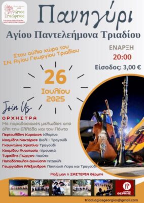 Ο Σύλλογος Πολιτιστικών Δραστηριοτήτων Τριαδίου o “Άγιος Γεώργιος” στο πλαίσιο του καθιερωμένου ετήσιου εορτασμού του Ιερού Παρεκκλησίου Αγίου Παντελεήμονα Τριαδίου σας προσκαλεί στην εκδήλωση που θα πραγματοποιηθεί το Σάββατο 26 Ιουλίου 2025, στον αύλειο χώρο του Ιερού Ναού Αγίου Γεωργίου Τριαδίου, στις 20.00μμ. Μια ξεχωριστή βραδιά με παραδοσιακές μελωδίες από όλη την Ελλάδα και τον Πόντο, γεμάτη κέφι, παράδοση και γνήσιο ελληνικό γλέντι, με την ορχήστρα μας να δίνει τον ρυθμό: Πεφτουλίδης Κυριάκος – Κλαρίνο, Κοσμίδης Νεκτάριος – Βιολί & Τραγούδι, Γκουντώνα Χριστίνα – Τραγούδι, Κοσμίδου Αναστασία – Κρουστά, Τυριτίδης Γιώργος – Λαούτο, Παπαδόπουλος Διονύσης – Νταούλι, Γεωργιάδης Αλέξανδρος – Ποντιακή Λύρα & Τραγούδι. Στις εκδηλώσεις θα συμμετέχει και ο Σύλλογος Φίλων Κρητικής Παράδοσης Ξαστεριά Θέρμης με παραδοσιακούς χορούς. Είσοδος: 3€