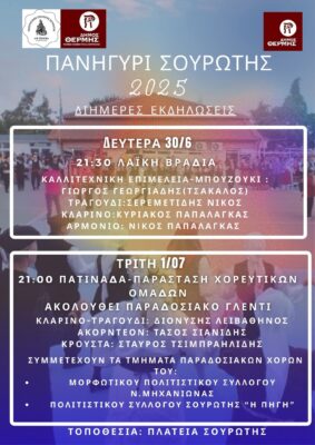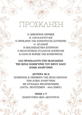 Ο Δήμος Θέρμης, η Κοινότητα Σουρωτής, ο Πολιτιστικός Σύλλογος Σουρωτής “Η Πηγή” και η Εκκλησιαστική Επιτροπή του Ιερού Ναού Αγίων Αναργύρων, σας προσκαλούν στις εορταστικές εκδηλώσεις της Ιεράς Πανήγυρης Σουρωτής, που θα πραγματοποιηθούν στις 30 Ιουνίου και 1 Ιουλίου 2025, στην Πλατεία Σουρωτής.