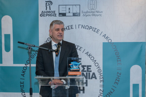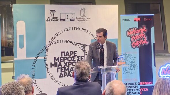 Στο σύντομο χαιρετισμό του ο υφυπουργός κ. Γκιουλέκας συνεχάρη τον Δήμο Θέρμης, τον δήμαρχο και το Συμβούλιο Νέων του Δήμου για την μεγάλη επιτυχία τους. Επισήμανε ότι αυτό είναι πολύ σημαντικό για έναν περιφερειακό δήμο και σε μια πόλη όπου λόγω των τριών πανεπιστημίων της, υπάρχει ισχυρή παρουσία της νεολαίας.