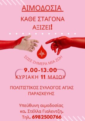 Ο Πολιτιστικός Σύλλογος Αγίας Παρασκευής σε συνεργασία με το τμήμα αιμοδοσίας του Ιπποκράτειου Νοσοκομείου, την Κυριακή 11 Μαΐου 2025, από τις 09:00 έως τις 13:00, στο χώρο του Συλλόγου. Η αιμοδοσία είναι μια πράξη αγάπης, αλληλεγγύης και ευαισθησίας προς τον συνάνθρωπό μας. Σε κάθε αιμοδοσία, χαρίζετε το δώρο της ζωής σε κάποιον που το χρειάζεται, ας αφιερώσουμε όλοι λίγο από τον χρόνο μας.