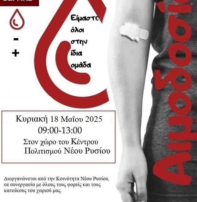 Εθελοντική αιμοδοσία διοργανώνουν η Κοινότητα Νέου Ρυσίου, με συνδιοργανωτές και πολύτιμους συμπαραστάτες όλους του τοπικούς φορείς και συγκεκριμένα, το Λαογραφικό Σύλλογο Νέου Ρυσίου “Η Αρετσού», τους αθλητικούς συλλόγους «Αναγέννηση» και «Ηρακλή», τους Συλλόγους Γονέων και Κηδεμόνων του δημοτικού σχολείου και του νηπιαγωγείου, το ΚΑΠΗ Νέου Ρυσίου και τον Τοπικό Κύκλο του Συμβουλίου Νέων. Η αιμοδοσία θα γίνει με την πολύτιμη συνδρομή του Τμήματος Αιμοδοσίας του νοσοκομείου «Άγιος Παύλος», την Κυριακή 18 Μαΐου στο χώρο του Κέντρου Πολιτισμού Νέου Ρυσίου, από τις εννέα το πρωί έως τη μία το μεσημέρι. Αφιερώνοντας πέντε λεπτά από το χρόνο μας, ίσως σώσουμε τη ζωή ενός συνανθρώπου μας. Ας ανταποκριθούμε όλοι σε αυτή την πρόσκληση αλληλεγγύης.