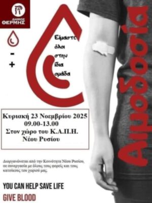 Εθελοντική αιμοδοσία διοργανώνει η Κοινότητα Νέου Ρυσίου, με τη συμμετοχή όλων των τοπικών φορέων και συγκεκριμένα, τον Ιερό Ναό Μεταμορφώσεως του Σωτήρος Ν. Ρυσίου, το Λαογραφικό Σύλλογο Νέου Ρυσίου “Η Αρετσού», τους αθλητικούς συλλόγους «Αναγέννηση» και «Ηρακλή», τους Συλλόγους Γονέων και Κηδεμόνων του Δημοτικού Σχολείου, των Νηπιαγωγείων Ν.Ρυσίου και του 2ου Γυμνασίου Θέρμης, το Κέντρο Πολιτισμού, το ΚΑΠΗ Νέου Ρυσίου και το Συμβουλίο Νέων Δήμου Θέρμης. Η αιμοδοσία θα γίνει σε συνεργασία με το Τμήμα Αιμοδοσίας του νοσοκομείου «Άγιος Παύλος», την Κυριακή 23 Νοεμβρίου στο χώρο του ΚΑΠΗ Νέου Ρυσίου, από τις 09:00 το πρωί έως τις 13:00.Αφιερώνοντας πέντε λεπτά από το χρόνο μας, ίσως σώσουμε τη ζωή ενός συνανθρώπου μας. Ας ανταποκριθούμε όλοι σε αυτή την πρόσκληση αλληλεγγύης.