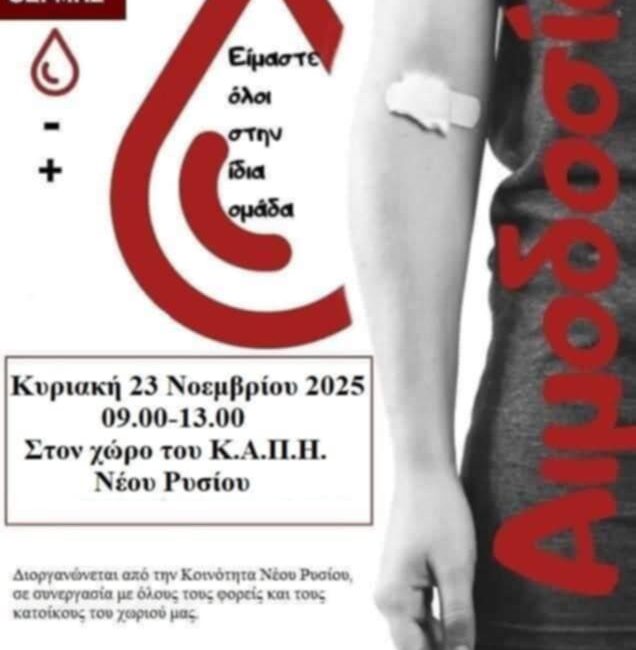 Εθελοντική αιμοδοσία διοργανώνει η Κοινότητα Νέου Ρυσίου, με τη συμμετοχή όλων των τοπικών φορέων και συγκεκριμένα, τον Ιερό Ναό Μεταμορφώσεως του Σωτήρος Ν. Ρυσίου, το Λαογραφικό Σύλλογο Νέου Ρυσίου “Η Αρετσού», τους αθλητικούς συλλόγους «Αναγέννηση» και «Ηρακλή», τους Συλλόγους Γονέων και Κηδεμόνων του Δημοτικού Σχολείου, των Νηπιαγωγείων Ν.Ρυσίου και του 2ου Γυμνασίου Θέρμης, το Κέντρο Πολιτισμού, το ΚΑΠΗ Νέου Ρυσίου και το Συμβουλίο Νέων Δήμου Θέρμης. Η αιμοδοσία θα γίνει σε συνεργασία με το Τμήμα Αιμοδοσίας του νοσοκομείου «Άγιος Παύλος», την Κυριακή 23 Νοεμβρίου στο χώρο του ΚΑΠΗ Νέου Ρυσίου, από τις 09:00 το πρωί έως τις 13:00.Αφιερώνοντας πέντε λεπτά από το χρόνο μας, ίσως σώσουμε τη ζωή ενός συνανθρώπου μας. Ας ανταποκριθούμε όλοι σε αυτή την πρόσκληση αλληλεγγύης.