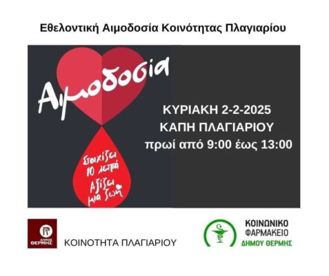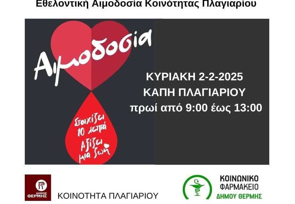 Η Κοινότητα Πλαγιαρίου και το Κοινωνικό Φαρμακείο σε συνεργασία με το τμήμα Αιμοδοσίας του Νοσοκομείου Άγιος Παύλος διοργανώνουν εθελοντική αιμοδοσία την Κυριακή 2 Φεβρουαρίου στο ΚΑΠΗ Πλαγιαρίου, από τις 09:00 έως τις 13:00.