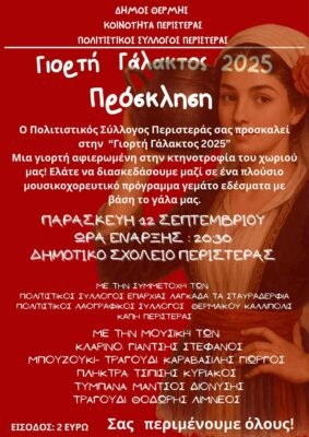 Με εδέσματα βασισμένα στο γάλα, φτιαγμένα με μεράκι από τις γυναίκες της Περιστεράς, παραδοσιακή μουσική και χορό, γιορτάζουν οι κάτοικοι της Περιστεράς το γάλα, ένα βασικό προϊόν του χωριού. Μια γιορτή αφιερωμένη στην κτηνοτροφία του χωριού και στο πολύτιμο προϊόν που παράγει: το γάλα. Ελάτε να διασκεδάσουμε και να γευτούμε τα παραδοσιακά, αγνά προϊόντα μας, την Παρασκευή 12 Σεπτεμβρίου, από τις 20:30 και μετά, στη Γιορτή Γάλακτος 2025 που θα πραγματοποιηθεί στο Δημοτικό Σχολείο Περιστεράς.