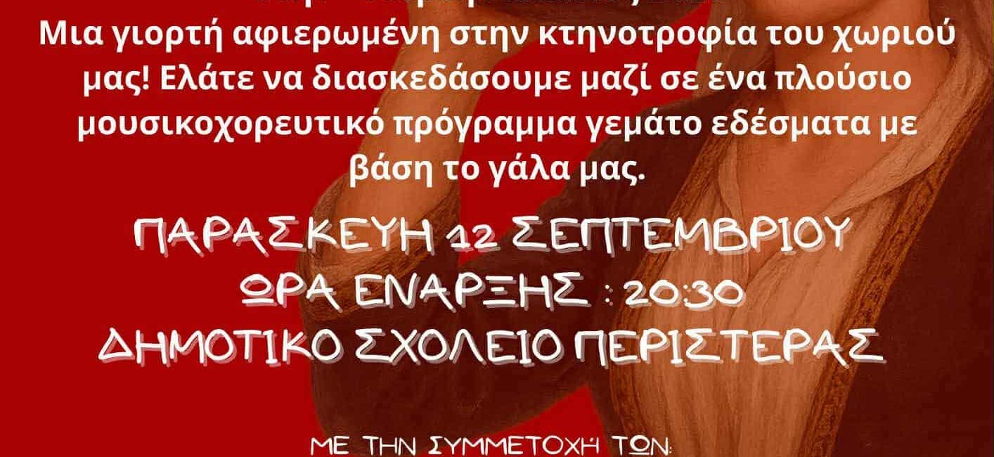 Με εδέσματα βασισμένα στο γάλα, φτιαγμένα με μεράκι από τις γυναίκες της Περιστεράς, παραδοσιακή μουσική και χορό, γιορτάζουν οι κάτοικοι της Περιστεράς το γάλα, ένα βασικό προϊόν του χωριού. Μια γιορτή αφιερωμένη στην κτηνοτροφία του χωριού και στο πολύτιμο προϊόν που παράγει: το γάλα. Ελάτε να διασκεδάσουμε και να γευτούμε τα παραδοσιακά, αγνά προϊόντα μας, την Παρασκευή 12 Σεπτεμβρίου, από τις 20:30 και μετά, στη Γιορτή Γάλακτος 2025 που θα πραγματοποιηθεί στο Δημοτικό Σχολείο Περιστεράς.