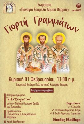 Το Σωματείο «Παναγία Σουμελά Δήμου Θέρμης» προσκαλεί τα μέλη και τους φίλους του στην καθιερωμένη Γιορτή Γραμμάτων και κοπή βασιλόπιτας, η οποία θα πραγματοποιηθεί την Κυριακή 1 Φεβρουαρίου, ανήμερα της μεγάλης εορτής των Τριών Ιεραρχών, προστατών των Γραμμάτων και της Παιδείας, στις 11.00, στο αμφιθέατρο του Πολιτιστικού Κέντρου Θέρμης. Κατά τη διάρκεια της εκδήλωσης θα γίνει η κοπή της βασιλόπιτας, καθώς και η βράβευση μαθητών, ως ελάχιστη αναγνώριση της προσπάθειας, της αριστείας και της προόδου τους.