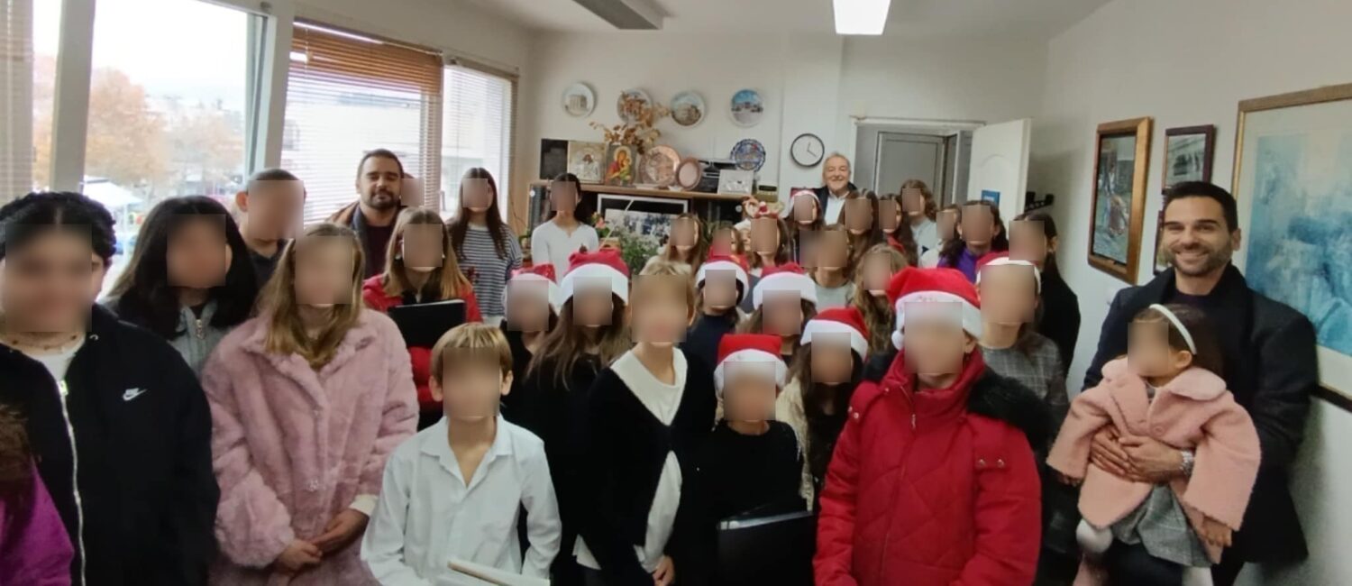 Οι μαθητές του Δημοτικού του Ελληνικού Κολλεγίου, συνοδευόμενοι από τη μπάντα του Γυμνασίου του σχολείου, επισκέφθηκαν σήμερα, Τρίτη 23 Δεκεμβρίου, τον Δήμαρχο Θέρμης και έψαλαν κάλαντα από διάφορες περιοχές της Ελλάδας, μεταφέροντας με έναν ξεχωριστό τρόπο το χαρμόσυνο μήνυμα της Γέννησης του Χριστού. Στη συνέχεια αντάλλαξαν θερμές ευχές με τον Δήμαρχο για τις Άγιες Ημέρες των Χριστουγέννων και της Πρωτοχρονιάς. Ο Δήμαρχος Θέρμης ευχαρίστησε τους μαθητές, τους εκπαιδευτικούς και το σχολείο τους, δηλώνοντας: «Σας ευχαριστώ θερμά που ήρθατε σήμερα και μου μεταφέρατε τις γιορτινές σας ευχές. Εύχομαι μέσα από την καρδιά μου να έχετε υγεία, αγάπη μεταξύ σας, χαρά στις οικογένειές σας και μια καλή, δημιουργική καινούργια χρονιά».