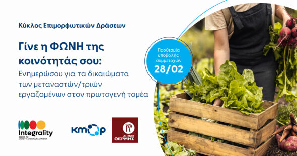Το ΚΜΟΡ (Κέντρο Κοινωνικής Δράσης και Καινοτομίας), σε συνεργασία με τον Δήμο Θέρμης, σε προσκαλεί στον κύκλο επιμορφωτικών δράσεων «Γίνε η φωνή της κοινότητάς σου: Ενημερώσου για τα δικαιώματα των μεταναστών/τριών εργαζομένων στον πρωτογενή τομέα».
