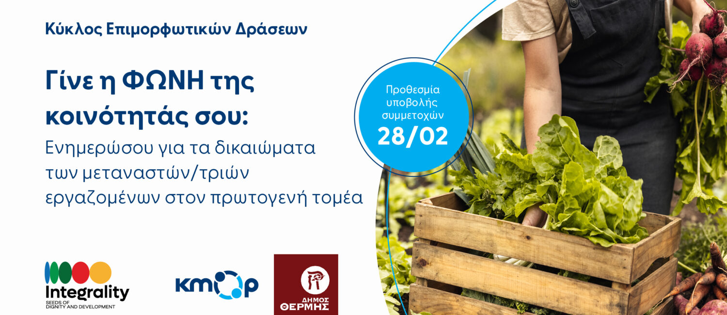 Το ΚΜΟΡ (Κέντρο Κοινωνικής Δράσης και Καινοτομίας), σε συνεργασία με τον Δήμο Θέρμης, σε προσκαλεί στον κύκλο επιμορφωτικών δράσεων «Γίνε η φωνή της κοινότητάς σου: Ενημερώσου για τα δικαιώματα των μεταναστών/τριών εργαζομένων στον πρωτογενή τομέα».