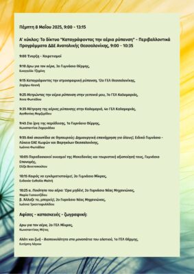 Στην αίθουσα εκδηλώσεων του Πολιτιστικού Κέντρου του Δήμου Θέρμης (ώρες 9.00-12.15), θα παρουσιαστούν προγράμματα Περιβαλλοντικής Εκπαίδευσης: