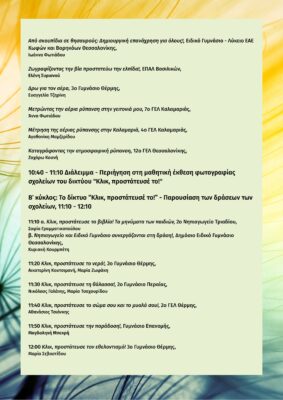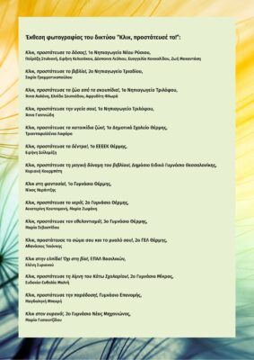 β. του Περιφερειακού Δικτύου Κεντρικής Μακεδονίας «Κλικ, προστάτευσέ το! – Η φωτογραφία στην Περιβαλλοντική Εκπαίδευση» της ΔΔΕ Ανατολικής Θεσσαλονίκης και