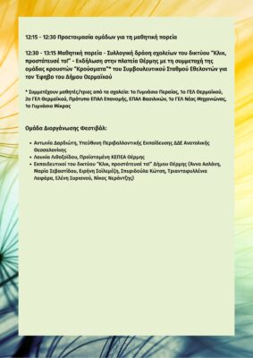 Το Φεστιβάλ θα ολοκληρωθεί με μαθητική πορεία και μουσικό δρώμενο στην κεντρική πλατεία Παραμάνα της Θέρμης από την εφηβική ομάδα κρουστών «Τα κρούσματα» του Συμβουλευτικού Σταθμού Εθελοντών για τον Έφηβο του Δήμου Θερμαϊκού (ώρες 12.15-13.15).