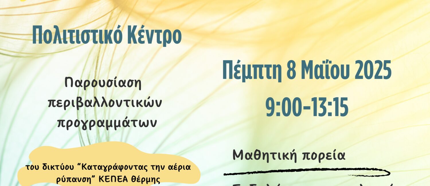 Στην αίθουσα εκδηλώσεων του Πολιτιστικού Κέντρου του Δήμου Θέρμης (ώρες 9.00-12.15), θα παρουσιαστούν προγράμματα Περιβαλλοντικής Εκπαίδευσης: