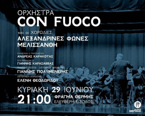 Ο Δήμος Θέρμης σας προσκαλεί σε μια μοναδική μουσική βραδιά, την Κυριακή 29 Ιουνίου στις 21:00, στο μαγευτικό περιβάλλον του Φράγματος Θέρμης, με ελεύθερη είσοδο για το κοινό. Η ορχήστρα του Δημοτικού Ωδείου Θέρμης «Con Fuoco» ενώνει τις δυνάμεις της με τις χορωδίες Αλεξανδρινές Φωνές και Μελισσάνθη για να προσφέρουν ένα πλούσιο μουσικό πρόγραμμα. Συμμετέχουν: ο τραγουδιστής Ανδρέας Καρακότας, στο μπουζούκι, ο Γιάννης Καρασάββας, στην ενορχήστρωση και διεύθυνση της ορχήστρας, ο Γιάννης Πολυμενέρης και στη διεύθυνση των χορωδιών η Ελένη Θεοδωρίδου. Μια βραδιά γεμάτη μελωδίες, χρώματα και συναισθήματα, κάτω από τον καλοκαιρινό ουρανό της Θέρμης. Σας περιμένουμε όλους!