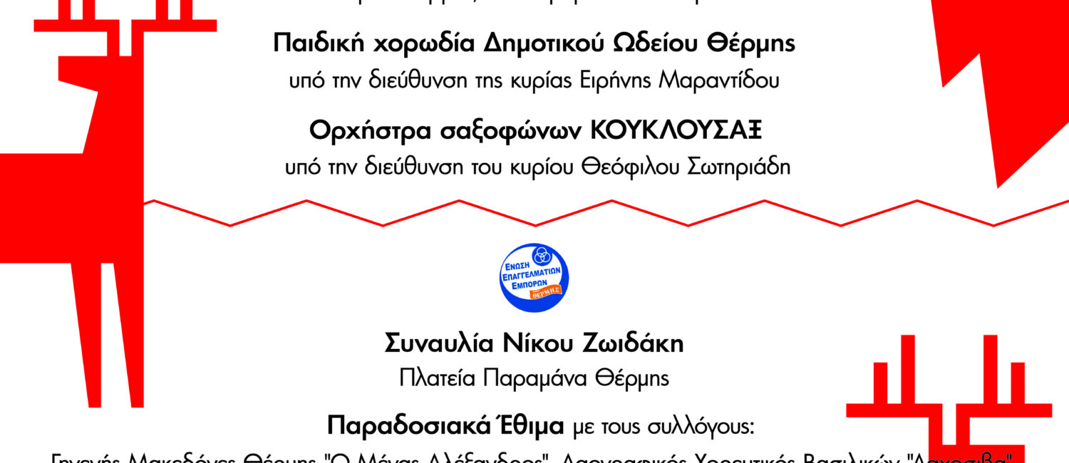 19.00: Άναμμα χριστουγεννιάτικου δέντρου, με τη συμμετοχή της παιδικής χορωδίας του Δήμου Θέρμης και της ορχήστρας σαξοφώνων «ΚΟΥΚΛΟΥΣΑΞ».