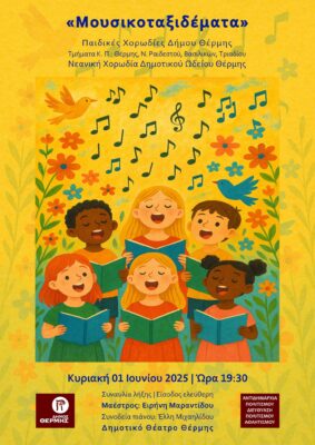 Την Κυριακή 1 Ιουνίου και ώρα 19:30 στο Δημοτικό Θέατρο Θέρμης θα πραγματοποιηθεί η εκδήλωση λήξης της σχολικής χρονιάς για την Παιδική Χορωδία του δήμου Θέρμης (τμήματα: Θέρμης, Ν. Ραιδεστού, Βασιλικών και Τριαδίου) και τη Νεανική Χορωδία του Δημοτικού Ωδείου Θέρμης. Η εκδήλωση ονομάστηκε «Μουσικοταξιδέματα» και όπως κάθε χρόνο οι μαθητές παρουσιάζουν στο τέλος της χρονιάς, ένα μικρό, αλλά πάντα χαρακτηριστικό μέρος της δουλειάς τους.