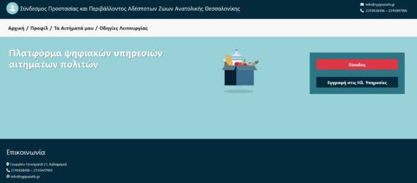Ο Σύνδεσμος Προστασίας & Περιβάλλοντος Αδέσποτων Ζώων Ανατολικής Θεσσαλονίκης (ΣΥ.Π.&Π.Α.Z.Α.Θ.) διαθέτει πλέον στους πολίτες των Δήμων-Μελών του (Θερμαϊκού, Θέρμης, Καλαμαριάς) τη νέα Ψηφιακή Πλατφόρμα Αιτημάτων, μέσω της οποίας όλα τα αιτήματα θα πρωτοκολλούνται αυτόματα με τη νέα εφαρμογή ηλεκτρονικής πρωτοκόλλησης και οι πολίτες θα λαμβάνουν ενημερωτικό email για την παραλαβή και την πορεία του αιτήματός τους.