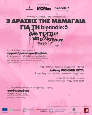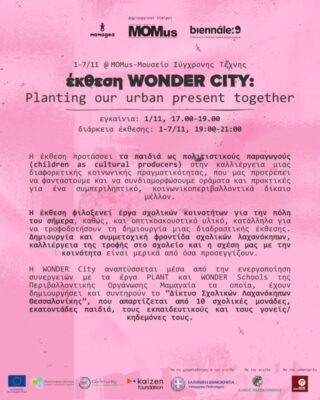 Τα εγκαίνια της Έκθεσης “WONDER CITY της Μαμαγαία θα πραγματοποιηθούν στο Μουσείο Σύγχρονης Τέχνης (ΔΕΘ, 1ος όροφος), το Σάββατο 1 Νοεμβρίου μεταξύ των ωρών 17:00 – 19:00. Η έκθεση διαρκεί έως την Παρασκευή 07/11. Δάσκαλοι/ες και μαθητές και μαθήτριες των συνεργαζόμενων τμημάτων μαζί με τους γονείς και κηδεμόνες τους όπως και ευρύτερα μέλη των σχολικών κοινοτήτων καλούνται να παρευρεθούν στα εγκαίνια της έκθεσης για να δουν και να μοιραστούν εμπειρίες με το κοινό της πόλης και τους επισκέπτες της έκθεσης.