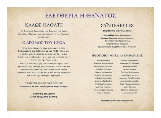 Το Θεατρικό Εργαστήρι της Ενορίας του Αγίου Νικολάου Θέρμης, σας προσκαλεί στην θεατρική παράσταση: «Ο ΔΡΟΜΟΣ ΤΟΥ ΗΡΩΑ», την Κυριακή 18 Μαΐου 2025 και ώρα 20.00, στην αίθουσα θεάτρου του Πολιτιστικού Κέντρου Θέρμης. Το σύγχρονο έργο είναι αφιερωμένο στην Επανάσταση της Χαλκιδικής το 1821 και μέσα από θεατρικές εικόνες και ζωντανούς διαλόγους, αναδεικνύει τον αγώνα, τη θυσία και την πίστη των προγόνων μας. Αποτελεί ένδειξη τιμής και σεβασμού στους αγωνιστές της τοπικής ιστορίας μας, τονίζοντας τον καθοριστικό ρόλο της Χαλκιδικής στον εθνικό ξεσηκωμό του 1821 – έναν ρόλο που συχνά παραμένει στη σκιά της επίσημης αφήγησης. Η παρουσία σας θα μας τιμήσει ιδιαίτερα.