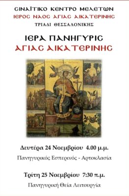 Ο Ιερός Ναός Αγίας Αικατερίνης Τριαδίου Θέρμης (Σιναΐτικο Κέντρο Μελετών) ανακοινώνει την τέλεση της Ιεράς Πανηγύρεως προς τιμήν της Αγίας ενδόξου Μεγαλομάρτυρος Αικατερίνης.