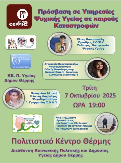 ο ΚΕ.Π. Υγείας της Διεύθυνσης Κοινωνικής Πολιτικής και Δημόσιας Υγείας του Δήμου Θέρμης με αφορμή την Παγκόσμια Ημέρα Υγείας συνεργάζεται με με τον Σύλλογο οικογενειών για την Ψυχική υγεία (Σ.Ο.Ψ.Υ.) και διοργανώνει ομιλία με θέμα: «ΠΡΟΣΒΑΣΗ ΣΕ ΥΠΗΡΕΣΙΕΣ ΨΥΧΙΚΗΣ ΥΓΕΙΑΣ ΣΕ ΚΑΙΡΟΥΣ ΚΑΤΑΣΤΡΟΦΩΝ».