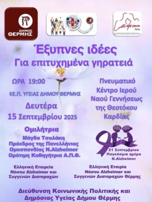 Το ΚΕ.Π. Υγείας του Δήμου Θέρμης και η Ελληνική Εταιρεία Νόσου Alzheimer και Συγγενών διαταραχών Θέρμης, σε συνεργασία με την Ελληνική Εταιρεία Νόσου Alzheimer και Συγγενών Διαταραχών, διοργανώνει ομιλία την Δευτέρα 15 Σεπτεμβρίου 2025 στις 19:00 στο Πνευματικό Κέντρο Ιερού Ναού Γεννήσεως της Θεοτόκου Καρδίας,με ομιλήτρια την κ. Μάγδα Τσολάκη Πρόεδρο της Πανελλήνιας Ομοσπονδίας Ν.Alzheimer και Ομότιμη Καθηγήτρια Α.Π.Θ.