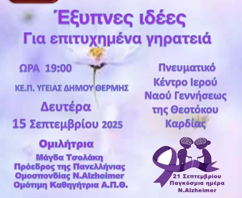 Το ΚΕ.Π. Υγείας του Δήμου Θέρμης και η Ελληνική Εταιρεία Νόσου Alzheimer και Συγγενών διαταραχών Θέρμης, σε συνεργασία με την Ελληνική Εταιρεία Νόσου Alzheimer και Συγγενών Διαταραχών, διοργανώνει ομιλία την Δευτέρα 15 Σεπτεμβρίου 2025 στις 19:00 στο Πνευματικό Κέντρο Ιερού Ναού Γεννήσεως της Θεοτόκου Καρδίας,με ομιλήτρια την κ. Μάγδα Τσολάκη Πρόεδρο της Πανελλήνιας Ομοσπονδίας Ν.Alzheimer και Ομότιμη Καθηγήτρια Α.Π.Θ.