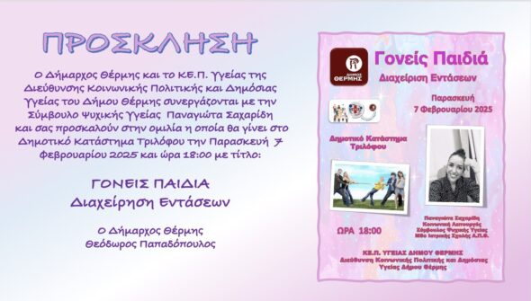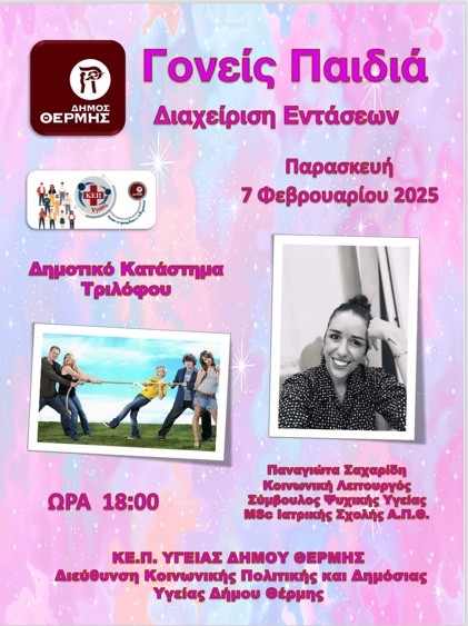 Το ΚΕ.Π. Υγείας του Δήμου Θέρμης,σε συνεργασία με την κ.Παναγιώτα Σαχαρίδη Κοινωνική Λειτουργός -Σύμβουλος Ψυχικής Υγείας Msc Ιατρικής Σχολής Α.Π.Θ, διοργανώνει ομιλία με θέμα: “Γονείς Παιδιά Διαχείριση Εντάσεων”. Η ομιλία θα πραγματοποιηθεί την Παρασκευή 7 Φεβρουαρίου 2025 και ώρα 18:00, στο Δημοτικό Κατάστημα Τριλόφου.