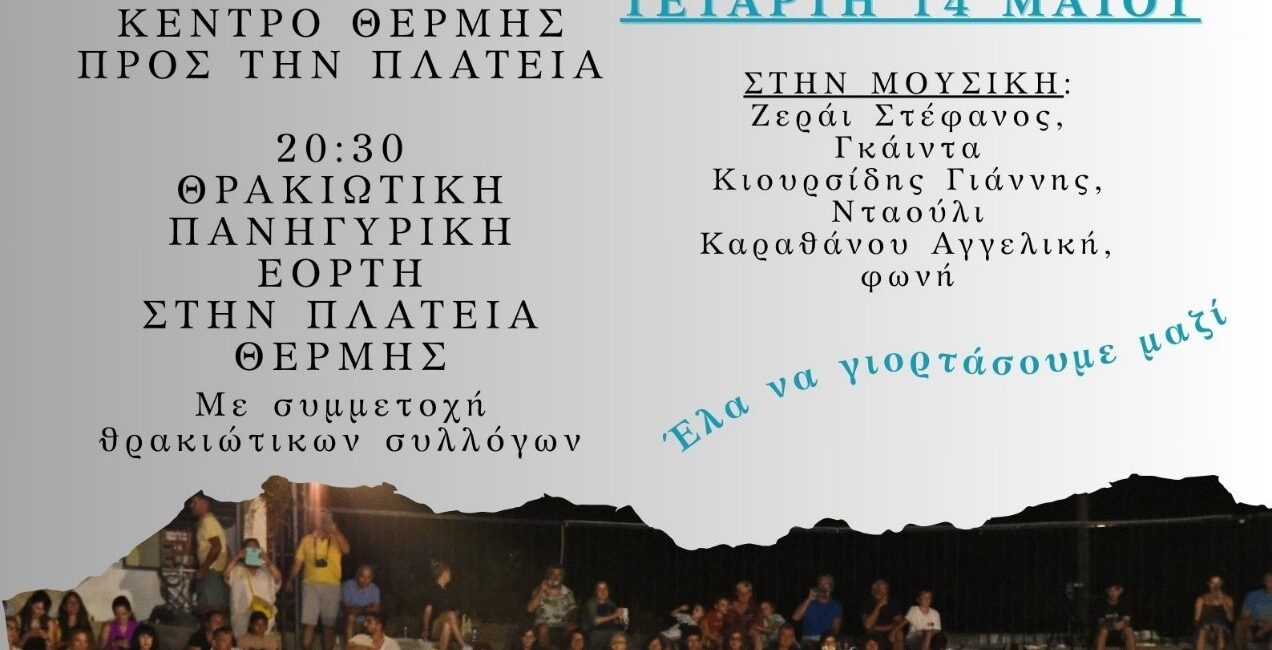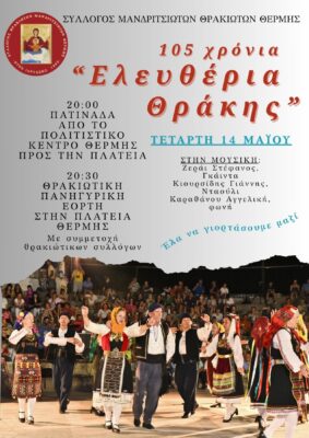 Φέτος συμπληρώνονται 105 χρόνια από την ενσωμάτωση της Θράκης στον εθνικό κορμό (1920–2025)! Η εκδήλωση θα γίνει την Τετάρτη 14 Μαΐου και ώρα 20:30 στην κεντρική πλατεία ¨Παραμάνα» της Θέρμης. Με την έναρξη της γιορτής θα πραγματοποιηθεί πατινάδα στις 20:00 από το Πολιτιστικό Κέντρο Θέρμης, έως την Πλατεία.