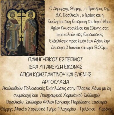Την Δευτέρα 2 Ιουνίου 2025 και ώρα 19:00μ.μ., θα πραγματοποιηθεί Πανηγυρικός Εσπερινός, Ιερά Λιτάνευση της Εικόνας των Αγίων και Αρτοκλασία στον Ιερό Ναό Αγίων Κωνσταντίνου και Ελένης Βασιλικών.