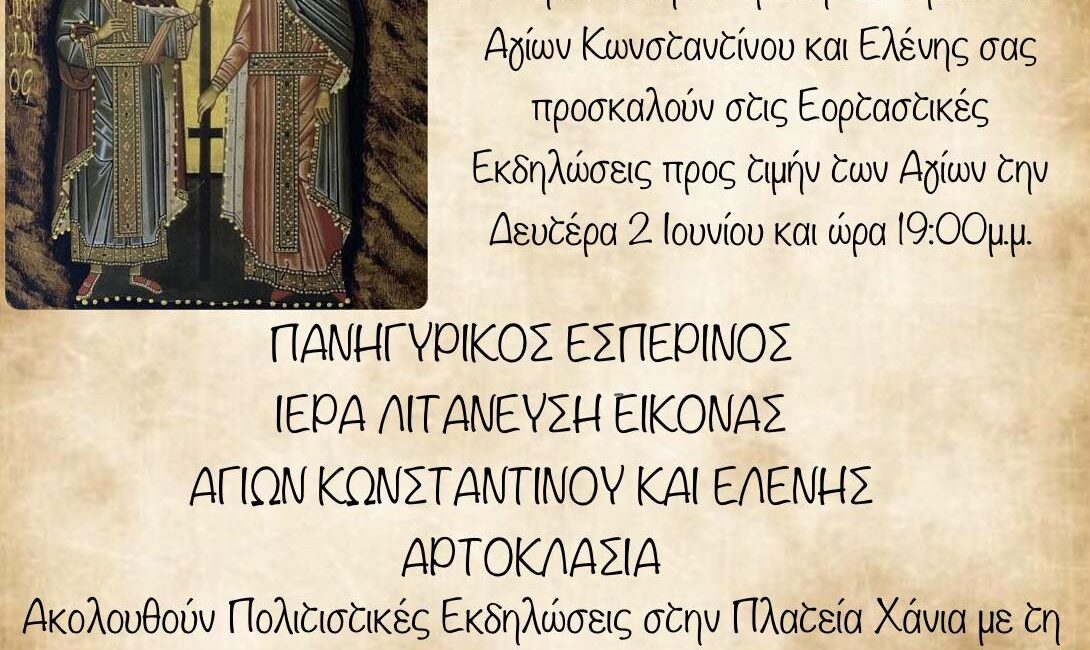 Την Δευτέρα 2 Ιουνίου 2025 και ώρα 19:00μ.μ., θα πραγματοποιηθεί Πανηγυρικός Εσπερινός, Ιερά Λιτάνευση της Εικόνας των Αγίων και Αρτοκλασία στον Ιερό Ναό Αγίων Κωνσταντίνου και Ελένης Βασιλικών.