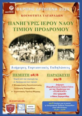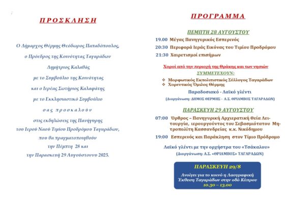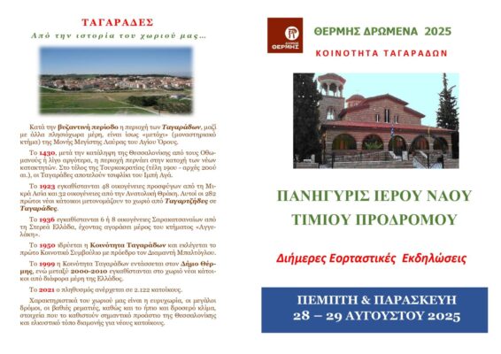 Ο δήμαρχος Θέρμης Θεόδωρος Παπαδόπουλος, ο πρόεδρος της Κοινότητας Ταγαράδων Δημήτριος Καλαθάς με το Συμβούλιο της Κοινότητας και ο Ιερέας Σωτήριος Καλαφάτης με το Εκκλησιαστικό Συμβούλιο, προσκαλούν στις εκδηλώσεις της Πανήγυρις του Ιερού Ναού Τιμίου Προδρόμου Ταγαράδων, που θα πραγματοποιηθούν την Πέμπτη 28 και την Παρασκευή 29 Αυγούστου 2025.