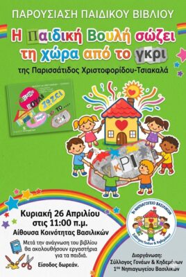 Ο Σύλλογος Γονέων και Κηδεμόνων του 1ου Νηπιαγωγείου Βασιλικών διοργανώνει μια ξεχωριστή εκδήλωση αφιερωμένη στη δύναμη της παιδικής φαντασίας και της συλλογικότητας. Την Κυριακή 26 Απριλίου, στις 11:00 π.μ., στην αίθουσα συνεδριάσεων της Κοινότητας Βασιλικών, θα πραγματοποιηθεί η παρουσίαση του παιδικού βιβλίου «Η παιδική Βουλή σώζει τη χώρα από το γκρι», της συγγραφέως και εκπαιδευτικού του 1ου Νηπιαγωγείου Βασιλικών, κ. Παρισσάτιδας Χριστοφορίδου-Τσιακαλά.