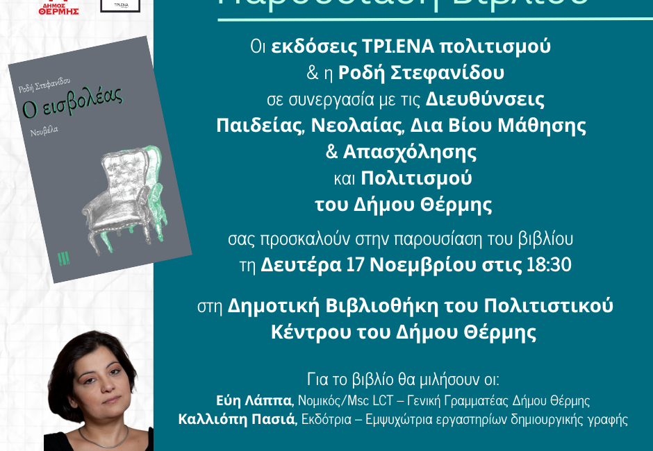 Οι εκδόσεις Πολιτισμού ΤΡΙ.ΕΝΑ και η συγγραφέας Ροδή Στεφανίδου, σε συνεργασία με τις Διευθύνσεις Παιδείας, Νεολαίας, Δια Βίου Μάθησης & Απασχόλησης και Πολιτισμού του Δήμου Θέρμης, σας προσκαλούν στην παρουσίαση της νουβέλας «Ο εισβολέας», τη Δευτέρα 17 Νοεμβρίου, στις 18:30, στη Δημοτική Βιβλιοθήκη του Πολιτιστικού Κέντρου Θέρμης.